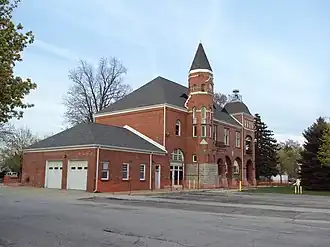 The former Marine City City Hall is a two-story, rectangular red brick Richardsonian Romanesque structure, sitting on a rusticated stone foundation and topped with a hipped roof. The structure measures 45 feet by 95 feet. It has rounded arch doors and windows and two towers: one squared and one octagonal.[3]