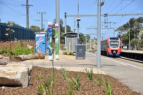 ![]() South-west bound view from Platform 2, showing the platforms landscaping and a Adelaide Metro 4000 class, November 2019 | |||||||||||