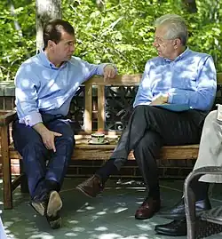 On 9 November 2011, Monti was appointed a lifetime senator by Italian President Giorgio Napolitano.[27] He was seen as a favourite to replace Silvio Berlusconi to lead a new unity government in Italy in order to implement reforms and austerity measures.[28] On 12 November 2011, following Berlusconi's resignation, Napolitano invited Monti to form a new government.[29] Monti accepted the offer, and held talks with the leaders of the main Italian political parties, declaring that he wanted to form a government that would remain in office until the next scheduled general elections in 2013.[30] On 16 November 2011, Monti was sworn in as Prime Minister of Italy, after unveiling a technocratic cabinet composed entirely of unelected professionals.[31] He also chose to hold the post of Minister of Economy and Finances.[32][33] On 17 and 18 November 2011, the Italian Senate and Italian Chamber of Deputies both passed motions of confidence supporting Monti's government, with only Lega Nord voting against.[34][35]