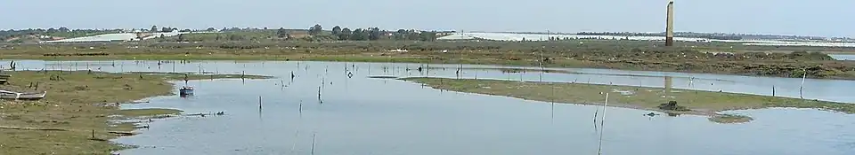 The current hydrography goes back to the 1755 Lisbon earthquake and the successive accumulation and removal of sediments, as well as being influenced by the Guadiana and recently the Tinto-Odiel rivers because of the construction of the Juan Carlos I breakwater and other dikes that modify the flow of sediments.[4] For a structure by zones, see the structure of the marshes.