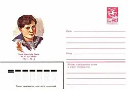 Tsukanova was posthumously awarded the title Hero of the Soviet Union by decree of the Supreme Soviet of the USSR, becoming the first (and only) woman that fought in the Soviet-Japanese war to receive the title; a memorial to Soviet soldiers that died in the Soviet-Japanese war was constructed on the mass grave where she was buried, with an accompanying bust made in her likeness.[5] The cities of Vladivostok where she studied medicine for several months and the city of Fokino also contain statues in her likeness.[6] In 1983 the USSR issued envelope featuring her portrait (pictured). Streets in Abakan, Barnaul, Fokino, Irkutsk, Krasnoyarsk, and Omsk were named after her in addition to a school and fishing boat. The memorial plaque by the eternal flame in Irkutsk on Lenin Street lists her name with those of other Heroes of the Soviet Union that lived in the city as well as numerous other memorials including the Vladivostok memorial of Heroes of the Soviet Union that fought in the Pacific war.[2][7]