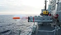Most versions (referred to as modifications or mods) are triple-tube sets that can be rotated or trained to face a target.[3] The exception is the Mod 9 sets, which only have two tubes and are fixed in position.[3] The Mark 32 can fire 12.75-inch (324 mm) torpedoes of the Mark 44, Mark 46, Mark 50 (from the Mod 17 tubes onwards),[3][4] and Mark 54 designs, and can be modified to use other torpedoes (such as the MU90 Impact aboard Royal Australian Navy frigates, or Royal Navy units using Sting Ray torpedoes).[5][6] The tubes are designed to be fired remotely, but manual firing controls are fitted as a backup to all but the Spruance-class destroyer's Mod 15 sets, as all aspects of the tubes' operation are controlled remotely.[3] The launch is powered by compressed air[3] in a rear flask, which doubles as each tube's breech, and the torpedoes are fire-and-forget weapons.