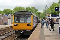 All services that stop at Marple are operated with diesel multiple units, as the Hope Valley line is not electrified; a mixture of Class 150, 156 and 195 units are used. When Arriva UK Trains took over the Northern franchise in April 2016,[10] services were run primarily by Class 142 Pacer trains. A commitment was made for all Pacers to be replaced with alternative trains by 2020, due to their lack of accessibility.[11] The final Pacer train stopped at the station on 6 March 2020 on a service from Sheffield.[12]