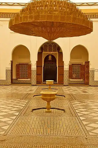 The palace is an example of late 19th-century and early 20th-century Moroccan architecture, one of many such palaces built by wealthy elites during this period.[3] The palace consists of a large central courtyard, which was originally an open riad garden planted with trees,[3] but today is fully paved and roofed over. The courtyard is centered around several fountains and surrounded by roofed galleries and wall fountains, all decorated with colorful zellij tilework and painted and carved cedar wood. The courtyard today also contains a huge, central chandelier made up of brass pieces cut into ornate geometric and arabesque motifs. Various rooms branch off the courtyard, including chambers with more ornate wood and stucco decoration. The palace also had roof terraces with a menzeh (pavilion) that provided it with views over the rest of the city. It was also equipped with multiple facilities typical of large palaces, such as kitchens and a hammam (bathhouse) – the latter being distinguished by its characteristic domed and vaulted chambers.[3][1][2]