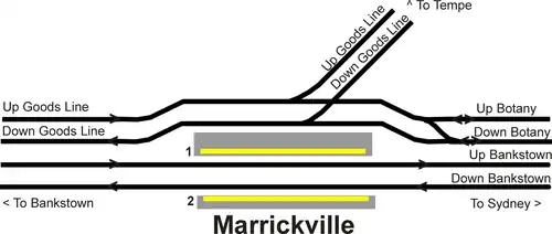 Marrickville railway station consists of one wayside platform to the south and an island platform to the north. Passenger rail only uses the south side of the island platform, with the Metropolitan Goods Line running on the north. The station buildings are original, as is the booking office at the western end of Platform 2. The station is accessed via stairs or lifts to both platforms from the concourse, or at a level entry onto Platform 2 from Station St. Illawarra Road is a major commercial shopping strip.[3]