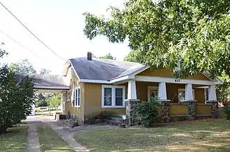 The Marshall Hickmon Homestead is a historic house on Arkansas Highway 87 in Bradford, Arkansas. It is a 1+1⁄2-story wood-frame structure, clad in stucco, with a jerkin-headed side-gable roof and a concrete foundation. Most of its front facade is sheltered by a gabled porch, supported by sloping square columns finished in shingles and set on concrete piers. The house was built in 1933, and is a high quality local example of Craftsman architecture.[2]