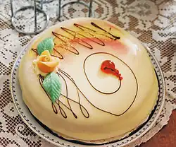 Marsipankake (Norwegian, "marzipan cake"), also known as marzipan princess cake or hvit dame ("white lady"), is a dessert from Norway featuring layers of sponge cake, vanilla cream, various puddings, jams, and other additives before being topped in a layer of marzipan.[1][2]