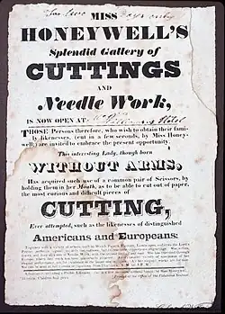 Many of her public appearances are documented in newspaper advertisements. According to these she would perform three times a day, each show lasting two hours and costing fifty cents a ticket. One broadside indicates silhouettes would be cut in a few seconds for twenty-five cents, half-price for children. Honeywell appeared in Salem, Massachusetts, in 1806 and 1809; Charleston, South Carolina in 1808 and 1834–5; in New York City in 1829,[7] and in Louisville, Kentucky, in 1839. She was in Boston in 1806.[3] In 1832 she is recorded as having appeared in Richmond, Virginia.[8] A broadside also indicates that she traveled to Europe, where her work was well received.[9] On many occasions, Honeywell appeared in the company of another, similar disabled artist, Sally Rogers.[10]
