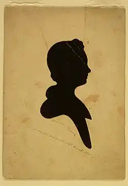 A paper cutout by Honeywell featuring the Lord's Prayer, dating to around 1830, is in the collection of the Metropolitan Museum of Art.[11] The New-York Historical Society also has a Lord's Prayer cutout by Honeywell.[6] An undated silhouette of a lady is owned by the Smithsonian American Art Museum.[12] The Abby Aldrich Rockefeller Folk Art Museum owns another cutout with the Lord's Prayer[13] as well as a broadside advertising her work.[14] Two of her silhouettes are owned by Historic Deerfield.[10] A silhouette of E. Tupper is held by the American Antiquarian Society.[15] The historical society of Montgomery County, Pennsylvania owns an example of her work as well.[16] A group of silhouettes by Honeywell were featured in a 2001 exhibit called "Ordinary Folks, Extraordinary Art" at the Macculloch Hall Historical Museum in Morristown, New Jersey.[17]