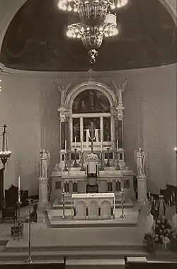 Fr. Dennis H. Donovan, who had been Fr. Danahy's curate, became pastor upon the latter's death in 1923. Fr. Donovan was responsible for the installation of a 500 seat chapel in the basement of the new church. This chapel incorporated the pews, confessionals, and Stations of the Cross from the original St. Mary's, which was converted into a parish hall at this time. A parish history relates that Fr. Donovan was a large and genial man, ideally suited in temperament to cope with life as Fr. Danahy's curate. Like his predecessor, Fr. Donovan had a fondness for dogs, and could often be seen driving his automobile around Newton with his chihuahua on the seat beside him.[26] Fr. Donovan was succeeded in 1935 by Fr. William J. O'Connell, who served as pastor until 1950. He supervised the construction of the present rectory in Elliot Street, which was designed by Timothy G. O'Connell and completed in 1943, and purchased an historic 1838 Greek Revival home adjoining the property for use as a parish center. The remaining property of the original church campus in Chestnut Street was sold during his pastorate. The original church no longer stands, but the rectory completed by Fr. Dolan remains, as well as the original stone walls which encircled the property. In 1950 Fr. Alexander McCarthy was named pastor but lived only four months. He was succeeded by Monsignor John R. Wall. Msgr. Wall modernized the lower church and completed work on the parish center acquired by Fr. O'Connell, which was christened the Saint Elizabeth Center. Msgr. Wall instituted Rosary devotions in May and October and was zealous in promoting social and fundraising activities. Msgr. Wall was succeeded in 1957 by Msgr. Daniel F. Riordan, who served as pastor until 1970, the centennial year of the parish. Fr. Michael F. Doocey was named pastor in 1970 and immediately began significant renovations to the interior of the church in response to the liturgical reform following the Second Vatican Council. Fr. Doocey served as pastor until 1993, when he was succeeded by Fr. Joseph L. Welsh. Fr. Welsh only remained as pastor for two years before he was succeeded by the Rev. Stephen A. Koen. Fr. Koen's pastorate lasted until 2002, when he was followed as pastor by Fr. Kenneth A. LeBlanc.[27]