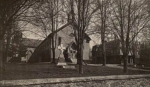 When Fr. John McCarthy became responsible for the mission of Newton Upper Falls, he immediately began to plan the construction of a church with the money raised for that purpose by his predecessor, Fr. Flood. By 1864 a plot of land had been purchased on the east side of Chestnut Street.[4] A wood frame gothic church was built soon after. The church was called St. Mary's and was consecrated by Archbishop Williams on November 17, 1867. In 1870, St. Mary's was made its own parish and Fr. Michael X. Carroll was appointed pastor. Fr. Carroll had time to begin the construction of a rectory beside the church before he was succeeded in 1871 by Fr. Michael Dolan. By 1875, St. Mary's already proved too small for the growing congregation, so a transept was added, increasing the seating capacity to 1,000. Upon the completion of this addition, the church was rededicated by Archbishop Williams on April 30, 1876, with Bishop James Augustine Healy of Portland delivering the sermon. Fr. Dolan was responsible for a number of other capital improvements, including the digging of a basement, the addition of frescoes, the installation of a slate roof, and the purchase of a new Hook & Hastings organ. Around this time, Fr. Dolan purchased several plots of land adjacent to the church campus with the intention of one day constructing a school and convent. During Fr. Dolan's pastorate, the congregation numbered roughly 1,500 and embraced Needham, Newton Upper Falls, Newton Lower Falls, and Newton Centre south of Beacon Street. Rev. Martin O'Brien succeeded Fr. Dolan as pastor in October, 1885. Fr. O'Brien administered the parish with zeal to rival his predecessor's, and was responsible for the purchase of more adjoining land, for the continued embellishing of the church and the grounds, and for the payment of all parish debts. He served as pastor until his death in 1890 and was buried on the grounds of the church, eventually being reinterred in St. Mary's Cemetery when the Chestnut Street property was sold.[5] By the time of Fr. O'Brien's death, the parish had grown to such a size that division was necessary, and separate parishes were established for Newton Lower Falls and Newton Centre.[6]