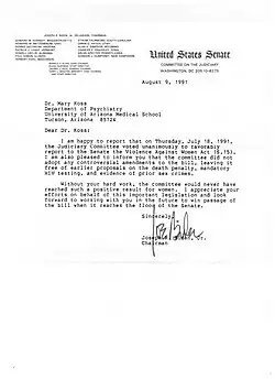 Koss defined the unacknowledged rape victims as women who have experienced the behaviors that define rape (oral, anal, or vaginal penetration against consent through force, bodily harm, or when incapacitated and unable to consent) but do not realize that their experience constitutes rape or chose not to view it that way.[4] This is now a well-accepted finding reaffirmed by other investigators in national surveys repeated in the early 2000s and most recently reported in 2012. Koss has served as an invited speaker and guest lecturer around the world. In 1991, she testified as an expert witness at the U.S. Senate hearings that led to the first passage of Violence Against Women Act. Koss has since conducted multiple legislative testimonies, including expert witness testimonies to the U.S. Senate Veteran's Affairs Committee, U.S. News & World Report, Senator Cory Brooker on restorative justice, and US Advisory Commission on Child Abuse. Other legal testimony from Koss includes working with Congressional Briefing on Violence Against Women, and the Legislative Policy Brief released by the Evelyn Jacobs Ortner Center on Family Violence.