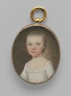 In 2006, five watercolor on ivory miniatures of children, a group of cousins from the Middleton family, were found at Shrublands (the family estate in England) and purchased by the Metropolitan Museum of Art in 2007. Each one measures 1 1/2 x 1 in. (3.8 x 2.5 cm) and is in its original gold case and signed MR and was painted around 1752 -1758.[4] The portrait of Henrietta Middleton is on display at the museum.[5]