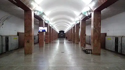 Mashinasozlar is a station of the Tashkent Metro on Oʻzbekiston Line. The station was opened on 6 November 1987 as part of the extension of the line from Toshkent to Chkalov.[1] Architectural and artistic design of the station is made columns and precast concrete structures. Columns and ceiling of the hall are decorated with reddish-green marble Syon-Shusha. Floors platform halls, vestibules and underground passages are covered with granite.
