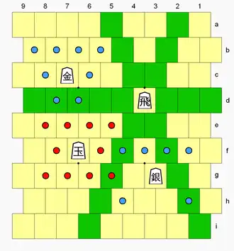 All normal shogi rules apply, including initial setup (see diagram), drops, promotion, and so on. The pieces, however, have specially defined moves.