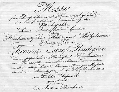 The bishop of Linz, Franz-Josef Rudigier, had already commissioned a Festive cantata from Bruckner in 1862 to celebrate the laying of the foundation stone of the new cathedral, the Maria-Empfängnis-Dom. In 1866, he asked Bruckner for a mass to celebrate the accomplishment of the construction of the Votive Chapel of the new cathedral. Because of a delay in completing the construction, the celebration of the dedication didn't take place until three years later, on 29 September 1869 on the Neuer Domplatz. The performers were the Liedertafel Frohsinn, the Sängerbund and Musikverein of Linz, and the wind band of the k.k. Infanterieregiment 'Ernst Ludwig, Großherzog von Hessen und bei Rhein Nr. 14'.[1] The manuscript and the Widmungspartitur are archived in the episcopate of Linz.[2]