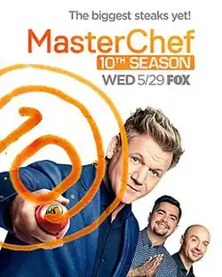 ![]() Promotional poster for season 10, featuring (L to R) Gordon Ramsay, Aarón Sánchez, and Joe Bastianich | |