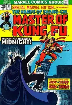 The character Shang-Chi first appeared in Special Marvel Edition #15 (December 1973) by Steve Englehart and Jim Starlin.[1] Shang-Chi appeared again in issue #16, and with issue #17 (April 1974) the title was changed to The Hands of Shang-Chi, Master of Kung Fu. Amidst the martial arts craze in the United States in the 1970s, the book became very popular, surviving until issue #125 (June 1983), a run including four Giant-Size issues and one Annual.