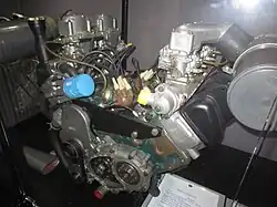 In March 1973 a team of Matra engineers led by Georges Pinardaud completed the initial design for project M560, which was to be a more powerful Bagheera.[3] A key part of the project was the creation of a unique "U engine" out of two existing Simca straight-4 engines. The blocks came from two different Simca applications and rotated in opposite directions but shared the same 1294 cc displacement. One block was from the 1100Ti and was adapted to transverse mounting while the other was from the Simca 1000 Rallye II in which it had been mounted longitudinally.[6][9] The two blocks were joined at an 82° angle using a common cast-aluminum sump that also carried a common oil supply for the engine. At the non-drive end another aluminum casting assured the alignment of the blocks while at the drive end a steel adapter fit the ends of both crankshafts. A sprocket and Morse chain from each crankshaft were connected to a 22.9 mm (0.9 in) shaft running down the middle of the sump that transmitted power from the left-hand crank to the right. Each block retained its own crankshaft, distributor, and water pump. The clutch and bell-housing of the engine from the Rallye II engine provided the transaxle mounting while a flywheel was only mounted to the 1100Ti crankshaft. The resulting 2,588 cc (157.9 cu in) 8-cylinder assembly was fitted with four Weber 36 DCNF carburetors and, with a 9.8:1 compression ratio, produced 126 kW (169.0 hp) at 6200 rpm and 216 N⋅m (159.3 lb⋅ft) at 4000 rpm.[6]