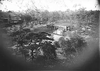 The Daimyō garden (大名庭園) is classed as a stroll garden with a spring-fed pond (池泉回遊式庭園) and, like the Hama-rikyū Gardens, are a rare example of the shio-iri (汐入形式) or "tidal" style, the water level of the central pond changing with that of Lake Biwa, from which it is in fact fed; the gardens are Japan's only example of a freshwater shio-iri style garden.[5] During the Edo period, activities in the garden included tea ceremonies, as well as fishing nearby and horse-riding on the track immediately to the west.[6] Remaining structures from the Edo period residence include the okuzashiki (inner room), storehouse, rice storehouse, kitchen building, and gatehouse.[7] After the abolition of the han system in Meiji 4 (1871), the family had their principal residence in Tōkyō, but continued to visit Hikone.[8] The residence - which came to be known as the Senmatsukan (千松館) - was extended and the gardens renovated; the large hall and entrance building date from 1889.[6][8] In 1947, the family moved back from Tōkyō, making this their principal residence.[8] Lost structures include a teahouse, shoin, and gate.[7]