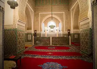 Behind the courtyard's eastern wall are the mausoleum chamber and adjoining rooms. The northernmost of these rooms, which can be accessed directly from the northeastern corner of the courtyard, consists of an indoor patio or courtyard covered by a high cupola ceiling.[4][12] The layout of this patio is similar to the Chamber of the Twelve Columns in the Saadian Tombs, consisting of a square delineated by twelve marble columns arranged in groups of three at each corner, around which runs a gallery space.[4] Another mihrab is set into the eastern wall, while a small side-chamber is set into the western wall. The pavement and lower walls are decorated with zellij tilework that feature circular or radiating geometric patterns, typical of Moroccan architecture. The upper walls and the areas around the mihrab and doorways are decorated with carved and painted stucco featuring arabesque and epigraphic motifs also typical of Moroccan architecture. At the center of the patio is an ornate fountain, and while the cupola ceiling above primarily features painted and carved wood. The cupola is high enough to allow for windows that bring in natural light. The marble columns feature Moroccan-Andalusian capitals carved with leaf, palm, and palmette motifs.[12][4] These marble columns, as well as the ornately carved marble panels in the archway leading to the mausoleum antechamber, are believed to be spolia taken by Moulay Isma'il from the former Saadian palaces of in the Kasbah of Marrakesh (such as the Badi Palace).[15]: 270