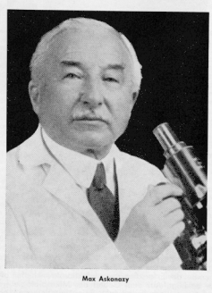 Askanazy made contributions in the fields of hematology and parasitology, also conducting important research of bone pathology and the formation of tumors in humans. In 1898 he was the first scientist to describe Hürthle cells, and in 1904 he was the first to link osteitis fibrosa cystica with parathyroid tumors.[1] In 1921, he provided an early description of Schaumann bodies (kalkdrusen),[2] and two years later, he was the first to describe a gastric carcinoid tumor.[3]