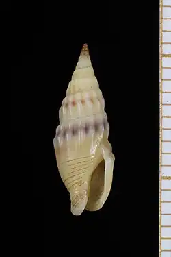 The elongated shell is narrow and turreted. It is formed of nine or ten very distinct whorls, slightly convex, ornamented with a great number of ribs formed like folds, subnodulous, approximate, numerous, and slightly raised upon the lowest whorl. These ribs are apparent only at the upper part, whilst the base is provided with transverse striae, easily distinguished. The aperture is ovate, and strongly notched. The thin outer lip is sharp and rounded at the lower extremity. The columella is a little bent. The general color is of a yellowish white, ornamented with ferruginous, minute lines, and with a surrounding band of a bluish brown, below each suture. The body whorl presents, towards its base, another larger and deeper colored band, which is obvious within the aperture.[2]