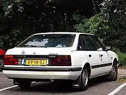 The second-generation rear-wheel drive Capella was available between October 1977 and 1982, in both sedan and coupé forms.[4] It was known on export markets as the 626, with the exception of the United Kingdom, where the vehicle was called the Mazda Montrose, the name being changed to honor the local Mazda dealership in Montrose. The Montrose was offered as an alternative to the Ford Cortina, which was popular at the time. It was released in 1978, although the model's introduction to most markets was delayed until 1979. Early models had two slightly different frontal treatments. Models equipped with 1.6 or 1.8-litre engines came with a more pronounced sloping grille and models with the 2-litre engine came with a more flush grille.[5] A bolder front and rear facelift, though similar in appearance, was carried out in September 1980 but this model was not sold in the UK, where the Montrose's styling remained unchanged.[6] It was, however, offered in the rest of Europe and this and later generations were particularly popular in Germany. This Capella was designed with more concern for aerodynamics and achieved a Cx value of 0.38.[4]