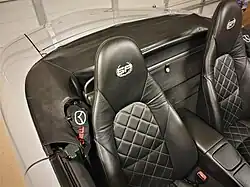 In 1999, Mazda celebrated the 10th anniversary of the MX-5 with the 10th Anniversary Model, a limited edition featuring some until-then exclusive features, namely a 6-speed manual transmission and Bilstein shock absorbers; 15 inch polished aluminum wheels with 195/50R15 tires and a Torsen limited-slip differential as standard.[4] Performance figures were slightly different, with quicker acceleration and higher top speed than the standard 5-speed model. The model's nickname among owners and enthusiasts was 10AM or 10AE (as in "10th Anniversary Edition"). The car had a unique Sapphire Blue Mica (called Innocent Blue in Japan) paint colour with two-toned black leather and blue Alcantara seats and floor mats, matching 3-spoke Nardi leather wrapped steering wheel and shift knob, BOSE audio system, bright gauge rings, carbon grained center console panel and stainless steel scuff plates. The addition of the sixth gear resulted in different performance results, with 0–100 km/h (62 mph) in 7.6 seconds, 0.3 seconds faster than the standard 5-speed model, according to Car and Driver, and 0.4 seconds faster according to Motor Trend.[5][6] Also thanks to the new 6-speed, its top rated speed increased from 210 to 214 km/h (130 to 133 mph). Combined fuel consumption improved from 8.5 to 8.0 L/100 km (33 to 35 mpg‑imp; 28 to 29 mpg‑US).