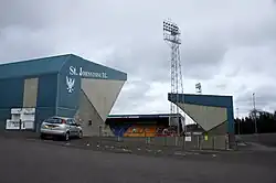 McDiarmid Park, the first purpose-built all-seater stadium in the United Kingdom, consists of four covered, single-tier stands.[8] Facilities include parking for 1,000 cars[3] and 100 coaches, a synthetic playing surface adjacent to the ground[8] (which is used as the team's training ground), and conference facilities within the Main (West) Stand. The stands are all of a similar height, with the Main Stand, on the western side of the ground, being slightly taller. The Main Stand also has greater leg room between rows of seats and includes an area with padded seats reserved for season-ticket holders, club officials and their guests. In the north-east corner of the ground there is a scoreboard, which was upgraded from electronic to digital in 2024.[13] The floodlights at McDiarmid are the same ones used at Muirton Park.[3] The club also tried to retain the square goalposts used at Muirton, but the timber frames could not be re-erected.[3]