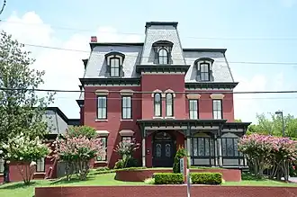 It is a 2+1⁄2-story brick building, with a mansard roof providing a full third story. The main facade is five bays wide, with a projecting central section topped by a mansarded tower. The roof is pierced by dormers with segmented-arch tops, and windows framed by decorative hoods. The main entrance is set in the base of the tower, with an elliptical stained glass light above. A porch shelters the entrance and wraps around to the right side, with a modillioned cornice and bracketed posts. Built in 1869, it is the last surviving post-Civil War mansion built along what became known as "Carpetbaggers' Row", as it is where a number of Northerners settled when moving to the city.[3]