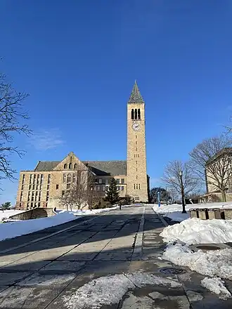 McGraw Tower is a masonry clock tower located on the campus of Cornell University in Ithaca, New York. The tower was known as Library Tower when it was first built but was renamed in 1961 in honor of either John McGraw, one of Cornell's original donors, or his daughter Jennie McGraw, the philanthropist in whose honor the tower and its adjacent library were originally commissioned by Henry W. Sage.[1][2][3][4][5]