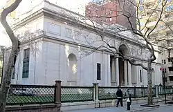 Smith, the last surviving partner, died in February 1961. The surviving associates, Milton Bode Steinmann (1899 – 1987), Alexander Stevenson Corrigill (1891 – 1961), Walker Oscar Cain (1915 – 1993) and Cornelius John White (1894 – 1962)–no relation to Stanford White–formed a new partnership under the name Steinmann, Corrigill, Cain & White.[33] After the deaths of Corrigill and White shortly thereafter, the firm was reduced first to Steinmann, Cain & White and second to Steinmann & Cain. Steinmann retired in 1967 and the firm continued under the leadership of Cain as Walker O. Cain & Associates.[34] In 1978 the firm was reorganized as Cain, Farrell & Bell to include two new partners, including Byron Bell. In the 1990s Bell changed the name of the firm first to Bell Larson and second to Bell Larson Raucher, acknowledging the contributions of partners Douglas Larson and Alice Raucher. At the turn of the millennium Bell downplayed his firm's relation to its now-distant origins, observing that "[i]t's a different time. That was a giant firm, a major force in the world. Our firm has 10 people."[31] A late work of the firm is Peterson Hall (1999) of the Council on Foreign Relations, a New Classical townhouse on East 68th Street in Manhattan.[35] The firm was later renamed Bell Donnelly and lastly to Byron Bell Architects and Planners in 2012.[36]