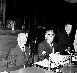 William McMahon had joined the Parliament in 1949 and by 1951 had been promoted to Minister for the Navy and for the Air. He had served as a major during the Second World War, and worked on home defence.[1] He served as Minister for Primary Industry (1956–58) and Minister for Labour and National Service (1958–66) in the Menzies government, then as Treasurer (1966–69) in the Holt government and Gorton government, and finally as Minister for External Affairs (1969–71) in the Gorton government. He was married to Sonia McMahon, who maintained a high public profile.[4]