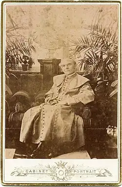 Paliulionis became canon of the Samogitian cathedral chapter in 1875 and procurator of the seminary in 1880.[2] After the death of bishop Motiejus Valančius, Tsarist authorities delayed in approving a new bishop, as Aleksander Kazimierz Bereśniewicz was only serving as apostolic administrator for the Diocese.[8] Paliulionis was appointed bishop of Samogitia on 15 March 1883,[9] in the hopes that he would be loyal to Russia.[10] He was consecrated on 3 June [O.S. 22 May] 1883 by Szymon Marcin Kozłowski, bishop of Lutsk and Zytomierz, assisted by Kazimierz Józef Wnorowski, bishop of Lublin, and Józef Hollak, titular bishop of Arad.[11]