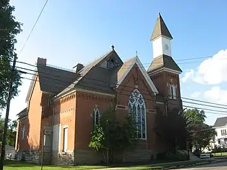 Mechanicsburg's Methodist Protestant church was organized on February 13, 1853, following a directive by the denomination's Ohio Conference from the previous September. Under the initial leadership of S.P. Kezerta, the fledgling church had a charter membership of ninety-two individuals.[2]: 600 The national Methodist Protestant Church had been formed by those who dissented from the church government of the Methodist Episcopal Church, objecting to the powers of the church's bishops.[3] Matters were radically different in Mechanicsburg,[4]: 473 which had developed a reputation as a "black abolition hole" among those pursuing the many runaway slaves who passed through the town on the Underground Railroad.[5]: 4 Turmoil in the national church disturbed many members of the Mechanicsburg Methodist Episcopal Church, and Kazerta gathered a congregation of abolitionist families into a new congregation. The members purchased a lot on West Sandusky Street, upon which a two-story brick church was constructed in 1858.[4]: 474 Mechanicsburg's Masonic lodge assisted in construction, and in return they were sold rights to the second story. In its early years, the congregation was weakened by members' departures to other communities or by death, and it was attached to another young congregation in Catawba until 1865.[2]: 600 As the years passed, the church grew stronger; membership reached 308 in 1879, at which time the building was remodelled and refurbished, and by 1890 a new building was needed. After concluding the lease with the Masons, the congregation destroyed the old building and erected a new structure on the same lot, and all debts were paid by the end of 1891. It was further strengthened by donations from two members: one gave his home for use as a parsonage, and the other endowed the church's Sunday school. By 1917, the membership had surpassed five hundred.[2]: 474 In 1939, the Methodist Protestant Church merged back into the Methodist Episcopal Church, producing The Methodist Church,[6] and the two local congregations subsequently rejoined as well. After the merger, the property was sold to a local Baptist congregation.[7]