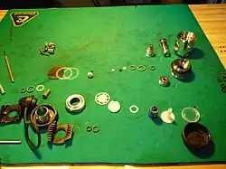 The mechanism of diving regulators is the arrangement of components and function of gas pressure regulators used in the systems which supply breathing gases for underwater diving. Both free-flow and demand regulators use mechanical feedback of the downstream pressure to control the opening of a valve which controls gas flow from the upstream, high-pressure side, to the downstream, low-pressure side of each stage.[1] Flow capacity must be sufficient to allow the downstream pressure to be maintained at maximum demand, and sensitivity must be appropriate to deliver maximum required flow rate with a small variation in downstream pressure, and for a large variation in supply pressure, without instability of flow. Open circuit scuba regulators must also deliver against a variable ambient pressure. They must be robust and reliable, as they are life-support equipment which must function in the relatively hostile seawater environment, and the human interface must be comfortable over periods of several hours.