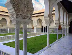 The term meshwar is later used to refer to reception areas or council chambers in the palaces of the region during the 13th-14th centuries and later. A meshwar was part of the citadel of al-Mansourah built by the Marinids in the 14th century just outside Tlemcen, Algeria, for example.[4] Before this, also in Tlemcen, the Zayyanids created a royal citadel known as the Qal'at al-Mashwar ("Citadel of the Mechouar"), still known today as the El Mechouar Palace. It was located on an earlier Almohad fortress and acted as the royal residence and center of power in the city in many periods.[2]: 223