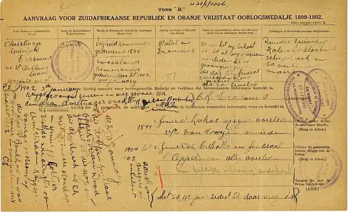- ^ a b c d e f g h The Soldier's Burden – The Anglo Boer War 1899–1902 – Medals to men and woman on the Boer side, by Henk Loots (Retrieved 2015-01-29)