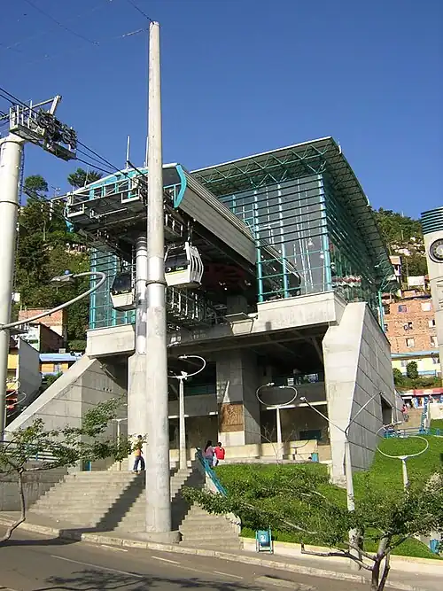 Social exclusion has eased due to the development of a transport infrastructure; a new system of public buses called "Metroplus" opened in December 2011, and gondolas called "MetroCable", which help connect the poorest barrio communities in the hills to the city, have been in operation since 2004, with more routes being added in recent years.[6] Additionally, an electric escalator 1,260 feet long was inaugurated on December 26, 2011, in Comuna 13, one of Medellín's poorest neighborhoods, making it one of the first of its kind in the world.[25] Today's Medellín includes spaces for art, poetry, drama, the construction of public libraries, the foundation of new ecological parks, and the inclusion of people of the city in its development.[26][27][28]