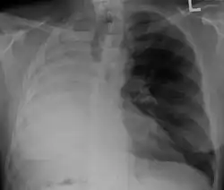 A pneumonectomy is a surgical procedure in which an entire lung is removed. A common reason for performing this procedure is for lung cancer originating in the lung itself.[19] This leads to a mediastinal shift towards the empty side of the thorax. Notably, patients can experience post pneumonectomy syndrome due to a severe mediastinal shift. This presents as difficulty breathing due to a shift of airways and rotation of the heart and great vessels. On x-ray, white out of the operated side and hyperinflation of the remaining lung is often observed.[20]