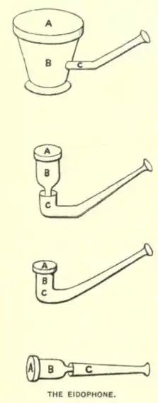 In 1885, while seeking means to indicate readily the intensities of vocal sounds, I first met with these [voice] figures, and, owing to their variety both in form and production, they have since absorbed much of my attention. The apparatus I have employed I call the eidophone. This is very simple. It consists merely of an elastic membrane, such as thoroughly flexible soft sheet-rubber, tightly stretched over the mouth of a receiver of any form, into which receiver the voice is introduced by a wide-mouthed tube of convenient shape. In some cases the receiver may be dispensed with, and the membrane be stretched across the open end of the tube itself.[11][13]