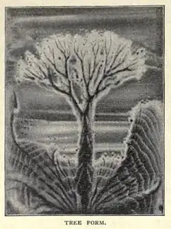 In 1885, while exercising her voice, she accidentally discovered what she called "voice-figures" or "voice-flowers", patterns created by the natural phenomenon of standing-wave resonance. She described the process which began with sand and/or lycopodium powder and later "flooding the disk of the eidophone with a thin layer of liquid, e.g., water or milk."[11] Vibrations registered as patterns on the disc of the eidophone. She described the patterns as "beautiful crispations" which would only appear if the pitches sung were not too forced. She experimented with and found that coloured glycerine produced intricate flower-like patterns in the liquid.[12]