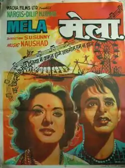 Mela (transl. The Fair) is a 1948 Indian Hindi-language romantic tragedy film. It was produced by and directed by S.U. Sunny for Wadia Movietone. It starred Dilip Kumar, Nargis, Jeevan, Rehman and Nur Jehan.[1] The film's music was composed by Naushad. Mukesh gave playback for Dilip in this film and one of the "Mukesh hits" was "Gaye Ja Geet Milan Ke". Mohammed Rafi's voice was used just once, for the popular song "Ye Zindagi Ke Mele", set in a fairground and picturised on a wandering mendicant at the start of the film.[2] The lyrics of the songs were written by Shakeel Badayuni with story and dialogue by Azam Bazidpuri.[3]
