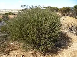 Melaleuca condylosa is a shrub growing to a height of about 3 m (10 ft) with papery bark. Its leaves are alternately arranged, 9.5–32 mm (0.4–1 in) long and 1.3–2.1 mm (0.05–0.08 in) wide, more or less linear in shape, almost circular in cross-section and have a pointed, although not sharp end.[2][3]