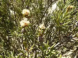 The flowers are in heads at the ends of branches which continue to grow after flowering. Each head is composed of 6 to 11 groups of flowers with three flowers in each group. The petals are 1.2–2.0 mm (0.05–0.08 in) long and fall off as the flower opens. There are five bundles of stamens around the flower, each with 5 to 7 pale yellow stamens giving the flower its colour. Flowering occurs mainly in October and November and is followed by almost spherical, knobbly clusters of woody capsules, each 2.0–2.5 mm (0.08–0.1 in) long.[2][3]