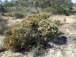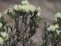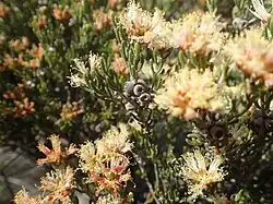 The flowers are arranged in heads near the ends of branches which continue to grow after flowering, sometimes in the upper leaf axils. There are one to four groups of three flowers in each head, the heads up to 15 mm (0.6 in) in diameter. The flowers appear in spring and are initially pale yellow to creamy-white but fade to pinkish-red. The petals are 0.8–1.2 mm (0.03–0.05 in) long and fall off as the flowers age. The stamens are arranged in bundles of five around the flower, with 6 to 13 stamens in each bundle. Flowering occurs from August to November and is followed by fruit which are woody capsules 3–5 mm (0.1–0.2 in) long in clusters.[2][3]