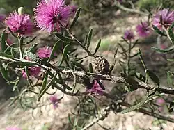 The flowers are a shade of purple, arranged in heads on the ends of branches which continue to grow after flowering and sometimes in the upper leaf axils. Before opening, the flower buds are covered with dark-coloured bracts which fall off as the flowers open. The heads are up to 20 mm (0.8 in) in diameter and contain 7 to 10 groups of flowers in threes. The stamens are arranged in five bundles around the flowers, each bundle containing between 4 and 7 stamens. Flowering occurs between June and October but mostly in September and is followed by fruit which are woody capsules 2–2.5 mm (0.08–0.1 in) long, in almost spherical clusters along the stems.[2][3]