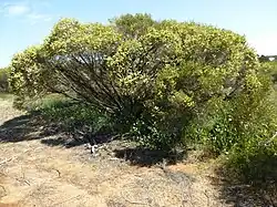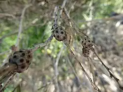 The flowers are yellow to white and arranged in heads or short spikes on the sides of the branches. Each head contains 4 to 13 groups of flowers in threes and is up to 15–17 mm (0.6–0.7 in) in diameter. The petals are 0.9–2 mm (0.04–0.08 in) long and fall off as the flower matures. There are five bundles of stamens around the flower, each with 3 to 7 stamens. Flowering occurs between August and October and is followed by fruit which are woody capsules, 1.8–2.2 mm (0.07–0.09 in) long in tight, almost spherical clusters.[2][3]