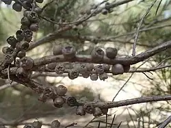 The flowers are white or cream-coloured and are arranged in spikes usually on the ends of branches which continue to grow after flowering, sometimes in the upper leaf axils. Each spike is up to 24 mm (0.9 in) in diameter and contains between 3 and 22 individual flowers. The petals are 2.5–4 mm (0.1–0.2 in) wide and fall off as the flower matures. The stamens are arranged in five bundles around the flower and each bundle contains 34 to 105 stamens. Flowering can occur at any time of the year and is followed by fruit which are woody capsules, 2–3 mm (0.08–0.1 in) long in loose clusters along the stems. Unlike the fruit of Melaleuca linariifolia the valves of the fruit protrude beyond the rim of the fruiting capsule.[2][3][4]